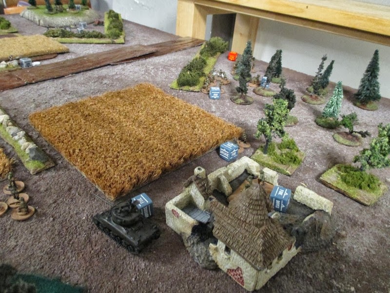 Both sides chose to run any troops that managed to arrive onto the board, the Americans making a B-line for the objective, while the Germans, wary of American sniper fire (which did drop one of the German's MG42 crew members), stopped some troops just behind a fence line and ran others along the side of the board, safely behind a small wheat field.